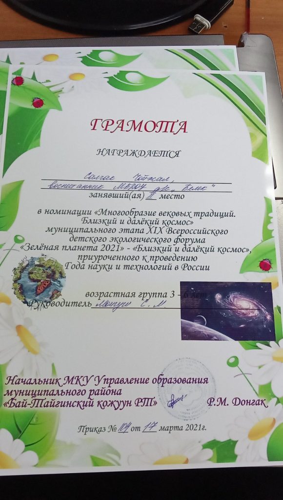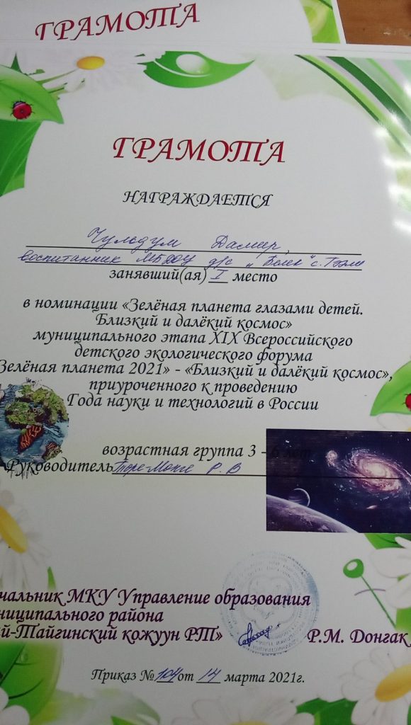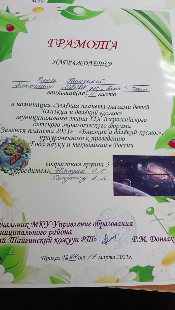Воспитанники МБДОУ детский сад «Белек» с.Тээли заняли I,II, II места в номинациях «Многообразие вековых традиций», «Зеленая планета глазами детей». Близкий и далекий космос» муниципального этапа XIX Всероссийского детского экологического форума «Зеленая планета 2021» — «Близкий и далекий космос», приученного к проведению Года науки и технологий в России.